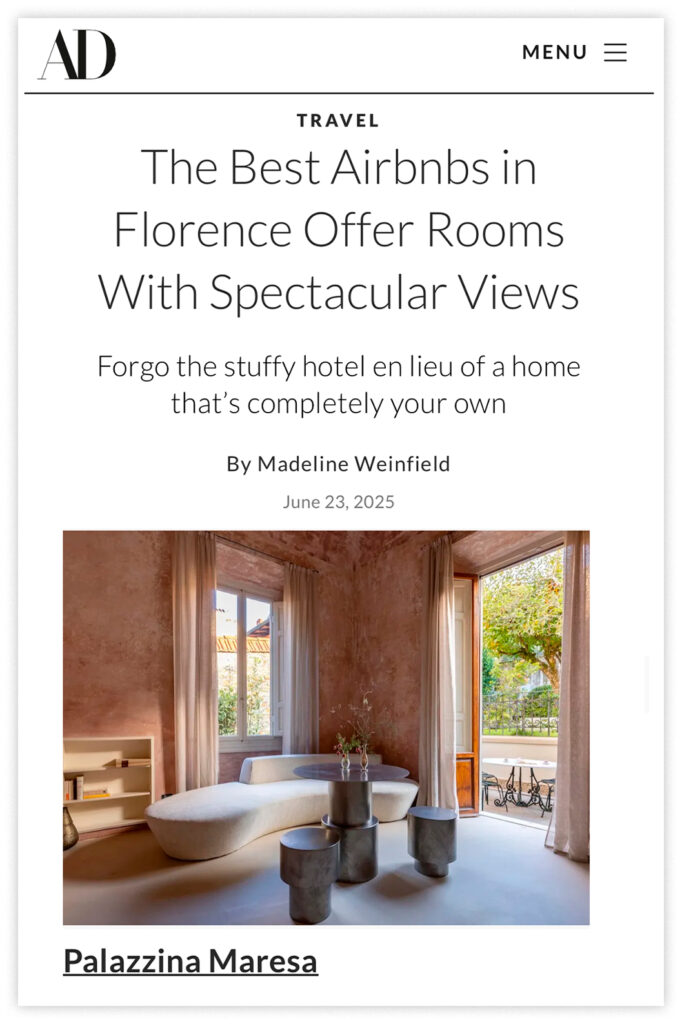 We are honored to share that Architectural Digest featured Palazzina Maresa in its June 2025 issue, naming it among Florence’s best Airbnbs. To receive such recognition only a few months after our opening is especially meaningful, as it reflects the dedication to restoring this 1926 building.